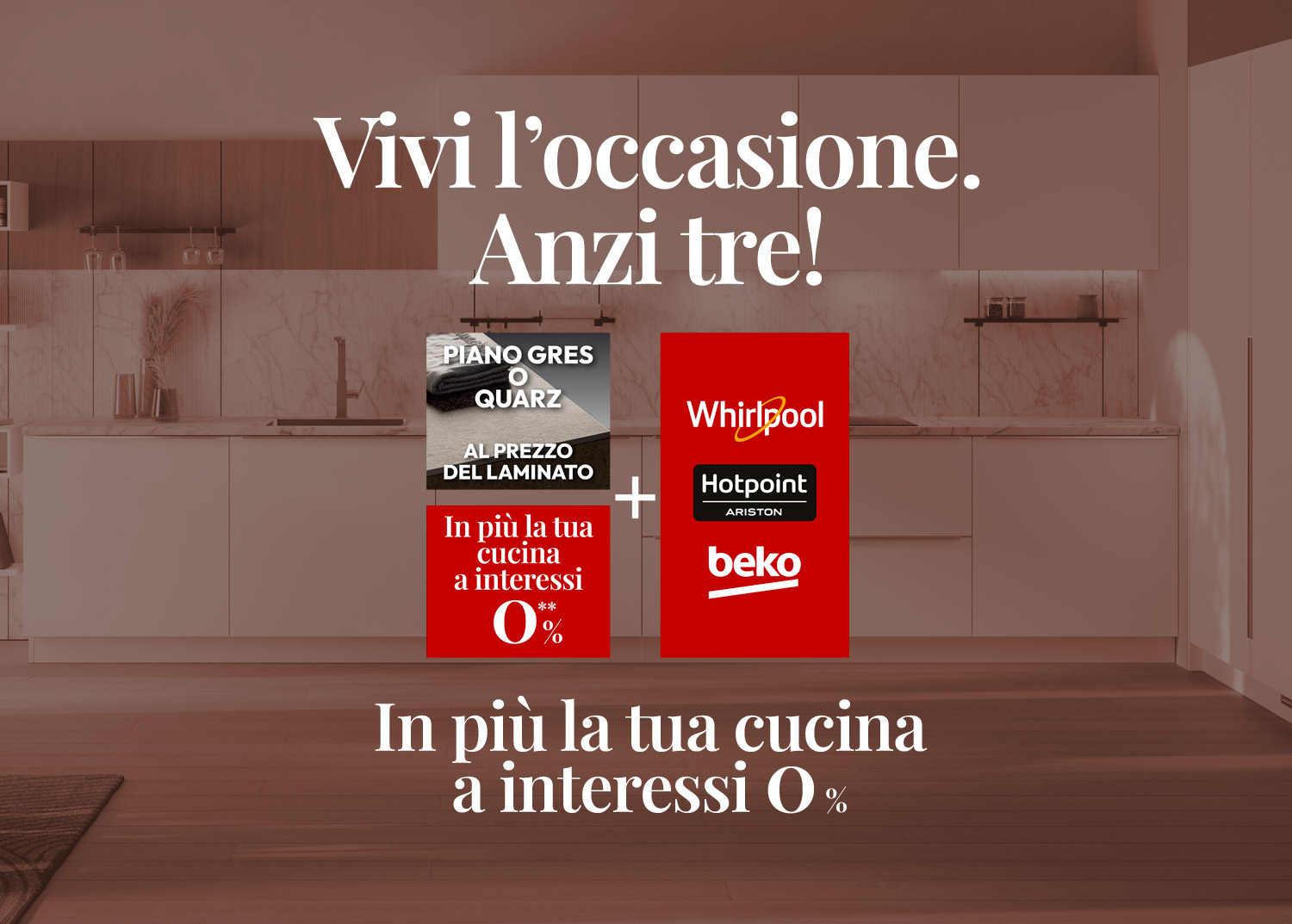 Con l’acquisto di una cucina Scavolini del valore minimo di 6000euro completa del set di elettrodomestici a marchio Whirlpool o Hotpoint o Beko (piano cottura, forno, lavastoviglie e frigorifero) per te compreso nel prezzo: il frigorifero SP408102 da 75 cm di Whirlpool, oppure la lavastoviglie H21HD526AS e il piano cottura HS3377CBF al 50% di Hotpoint, oppure la lavastoviglie BDIN36530 di Beko e il piano Gres o Quarz è al prezzo del laminato.